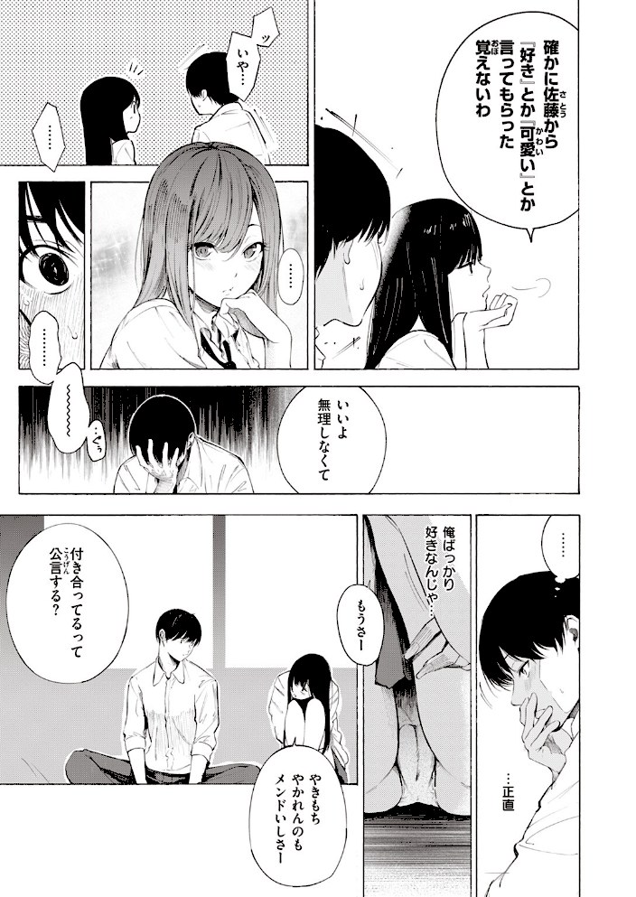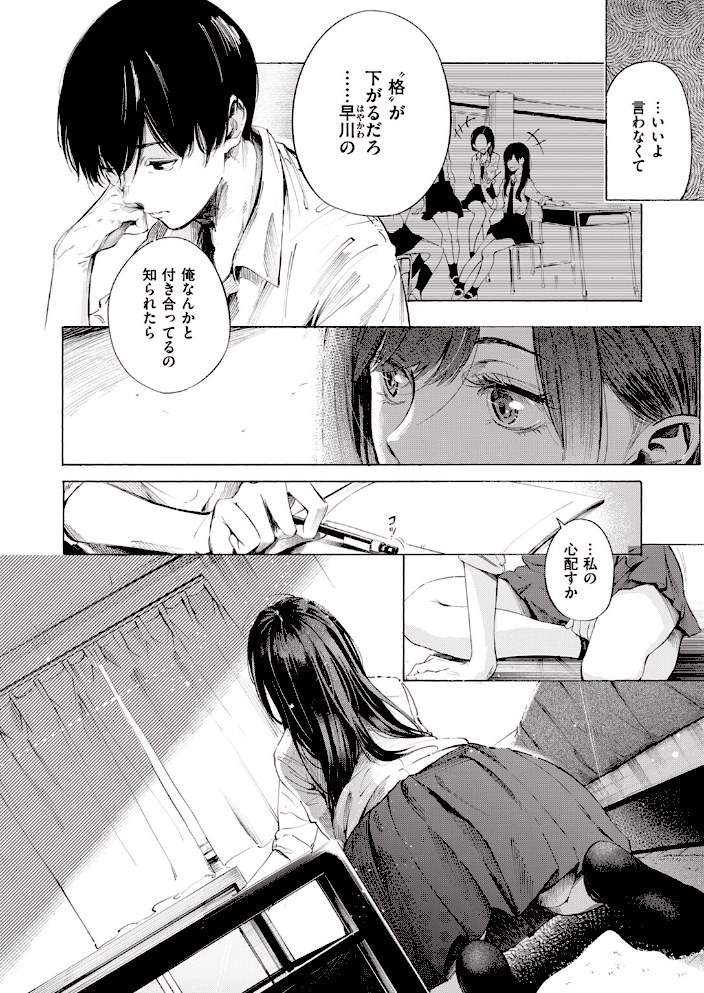 誰にも内緒で付き合っているふたり。だが、佐藤はなんで自分が早川と付き合っているか腑に落ちず、今日も早川が告白されたという話を聞いてモヤモヤ。